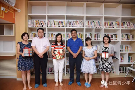 启动仪式上,朝阳区教委社区教育科韩斌科长、朝阳区社区学院教育处孙国华处长和朝阳区社区青少年教育培训中心石利华副主任为社区捐赠书籍,平房地区办事处计生文教办石茜主任、逸翠园社区党委谢丽萍书记和居民代表牛锐女士接受捐赠。