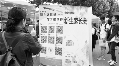 9月1日,中央财经大学新生报到现场,金融学院的学生邀请新生扫码入群。