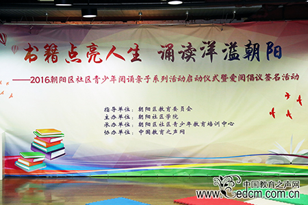2016朝阳社区青少年阅诵亲子系列活动启动仪式是一个美好的开端,丰富多彩的亲子阅读系列活动将引领家庭阅读风尚,提升青少年儿童的语言表达能力、思辨能力与交际能力,为社区、家庭、学校搭建一个三位一体的学习平台,让广大家长孩子感受亲子阅读魅力,培养良好的阅读习惯,营造书香氛围,培育良好家风,促进青少年健康智慧成长。