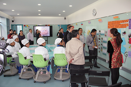 首先,白俊萍副校长对学校未来实验室的教学理念和管理方法向来宾进行了介绍。学校未来学校实验室是将综合实践活动课程中的研究性学习、科学课、信息技术、劳动技术课融合在一起,实现课程整合,以项目引领学习,初步探索学习方式、评价方式的变革,提升学生的核心素养。从实验室建设至今,经历了调研阶段、学习阶段、全面建设阶段、初步探索阶段以及再次创新等五个阶段。学校将以未来学校实验室为龙头,打造以培养学生核心素养为目标的课程体系。