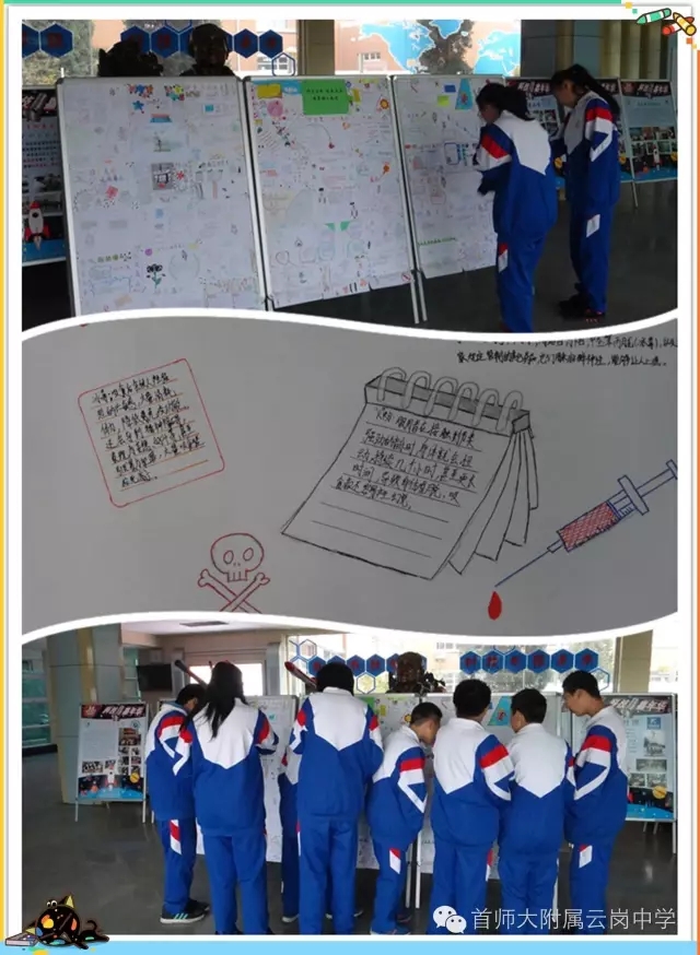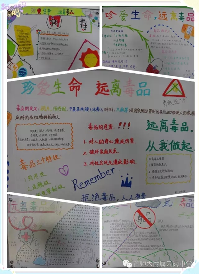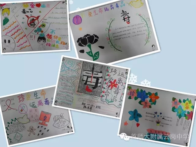 因此,首师大附属云岗中学利用健康课平台,对青少年学生及时开展预防性禁毒教育,施教于先,防患于未然,弘扬正能量,宣传社会主义核心价值观。同学们将感受凝聚在一张张精美的手抄报中,与全校同学共同分享。