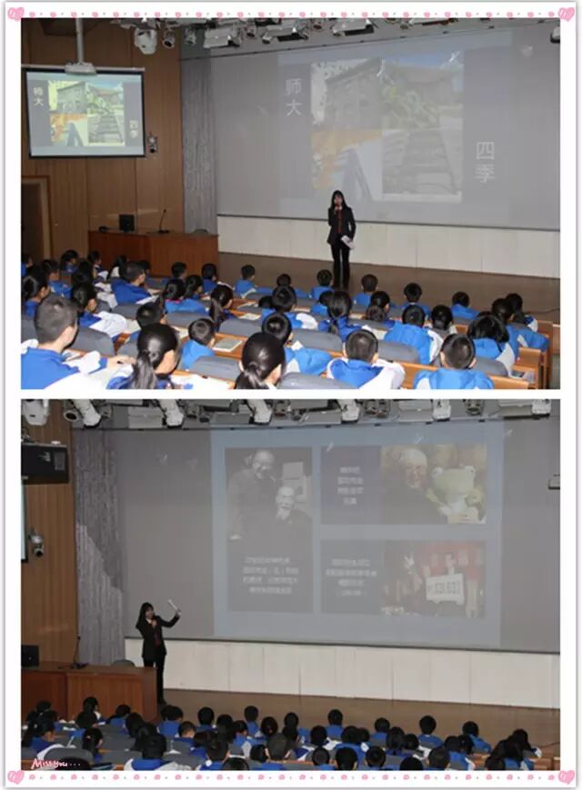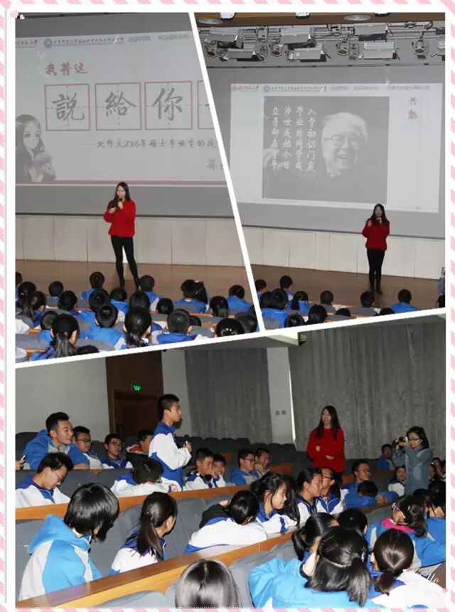 参观完校园,同学们齐聚师大著名的敬文讲堂,参加北师大基础教育对外合作办学部为同学们精心设计的交流活动。在两段关于北师大和北师大合作办学的视频之后,合作办学部罗丽副主任对同学们回到北师大表示了真诚的欢迎,并通过讲述启功先生与陈垣校长之间的故事,向同学们阐释北师大人的精神和气质,鼓励同学们以北师大人的精神激励自己,争做优秀北师大人。之后,北师大2016级优秀硕士毕业生蒋亚娜与同学们进行了一场主题为“说给你听”的交流活动。蒋亚娜在北师大本科和研究生学习了7年,毕业后自主创业开办了公司,在师大就读期间她学业优异,能力突出,学生活动出色。交流过程中,她结合自身成长历程,从“北师大能带给你的、你现在能做的、你初入大学能做的”几个方面切入,深入浅出,很接地气,加上她语言幽默风趣,现场气氛十分热烈。会后,桂成伟副校长向合作办学部表示了感谢,并介绍了北师大四附中在师资培训、项目研究、活动组织等方面与北师大的密切联系。