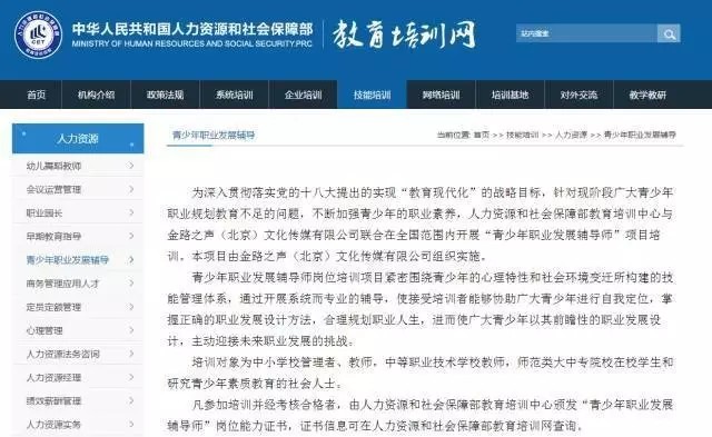 为了更好地对学生进行职业发展辅导,2013年人力资源和社会保障部教育培训中心与金路之声(北京)文化传媒有限公司联合在全国范围内开展"青少年职业发展辅导师"专项岗位能力培训工作,并由金路之声(北京)文化传媒有限公司全面具体负责"青少年职业发展辅导师"培训项目在全国推广的组织工作。