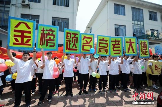 资料图:2016年6月6日下午,湖南长沙同升湖实验学校的2000多名师生及部分家长高举横幅标语为高考学子呐喊加油。 杨华峰 摄