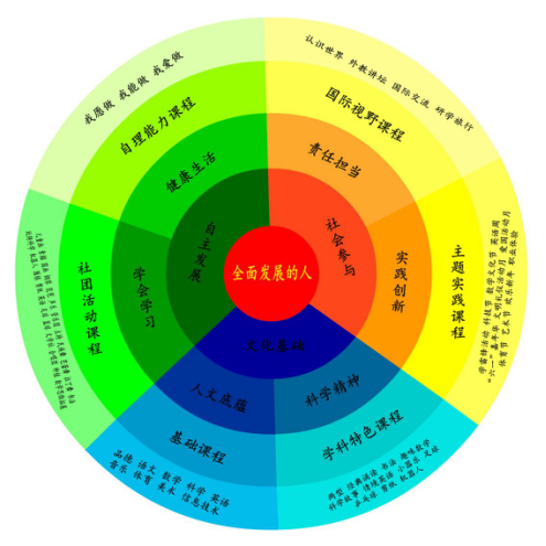 学校在深入分析校情、师情、学情的基础上,经过六年的不断完善,从顶层设计着眼,从细处入手,系统设计制定课程建设方案,形成基础课程、学科特色课程、主题实践课程、社团活动课程、国际视野课程和自理能力课程,并一直予以实施。这六大课程无缝对接了“核心素养”的人文底蕴、科学精神、学会学习、实践创新、责任担当和健康生活六大素养。