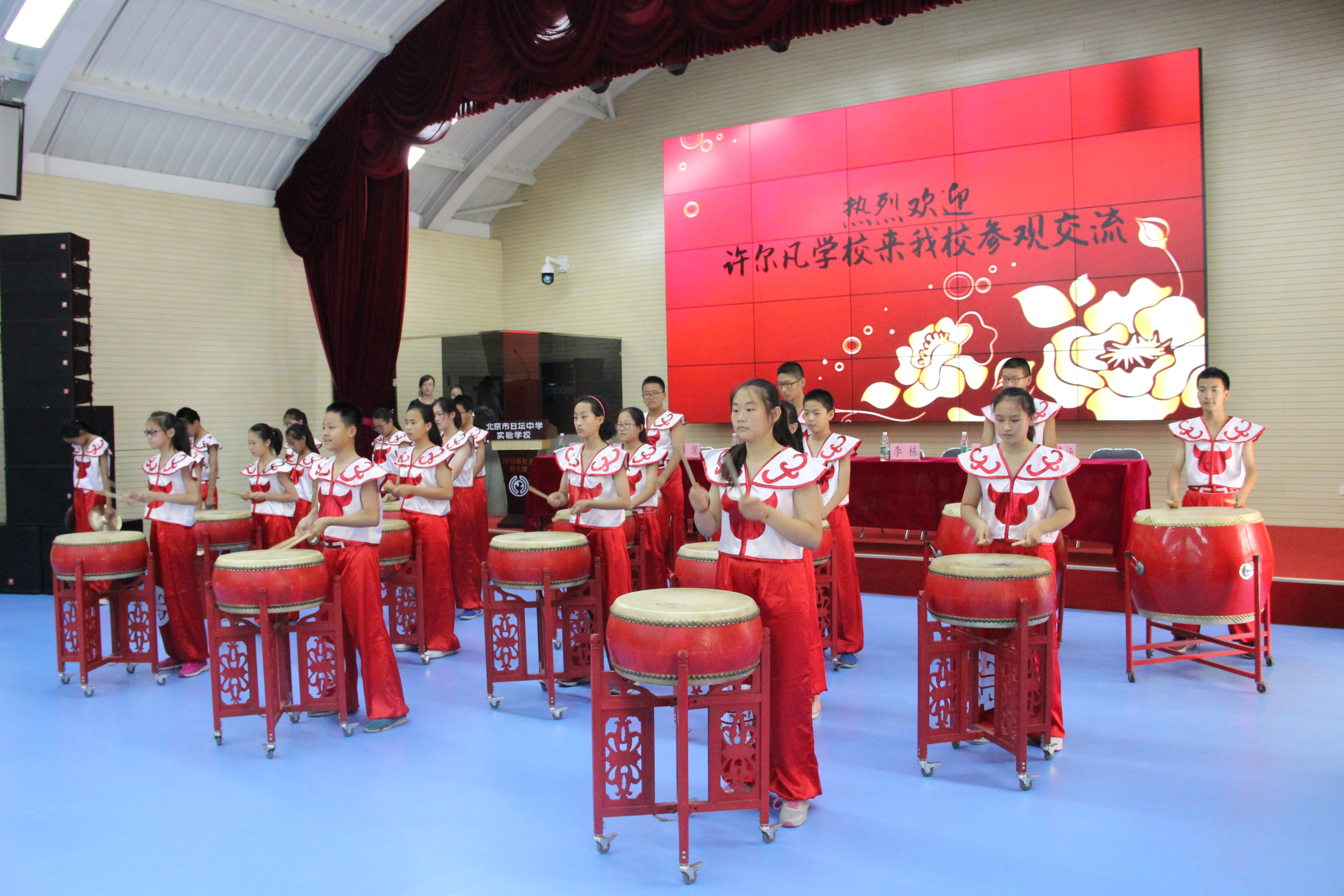 操场上,传统的舞龙舞狮表演表达了同学们对远道而来的客人的欢迎之情;在多功能厅,民族鼓乐队用欢快的节奏敲响了合作之意;日坛中学实验学校的宣传片和老师的汇报交流充分展示了该校丰富多彩的特色课程和项目式学习的开展情况。
