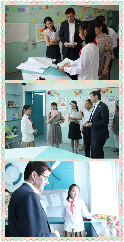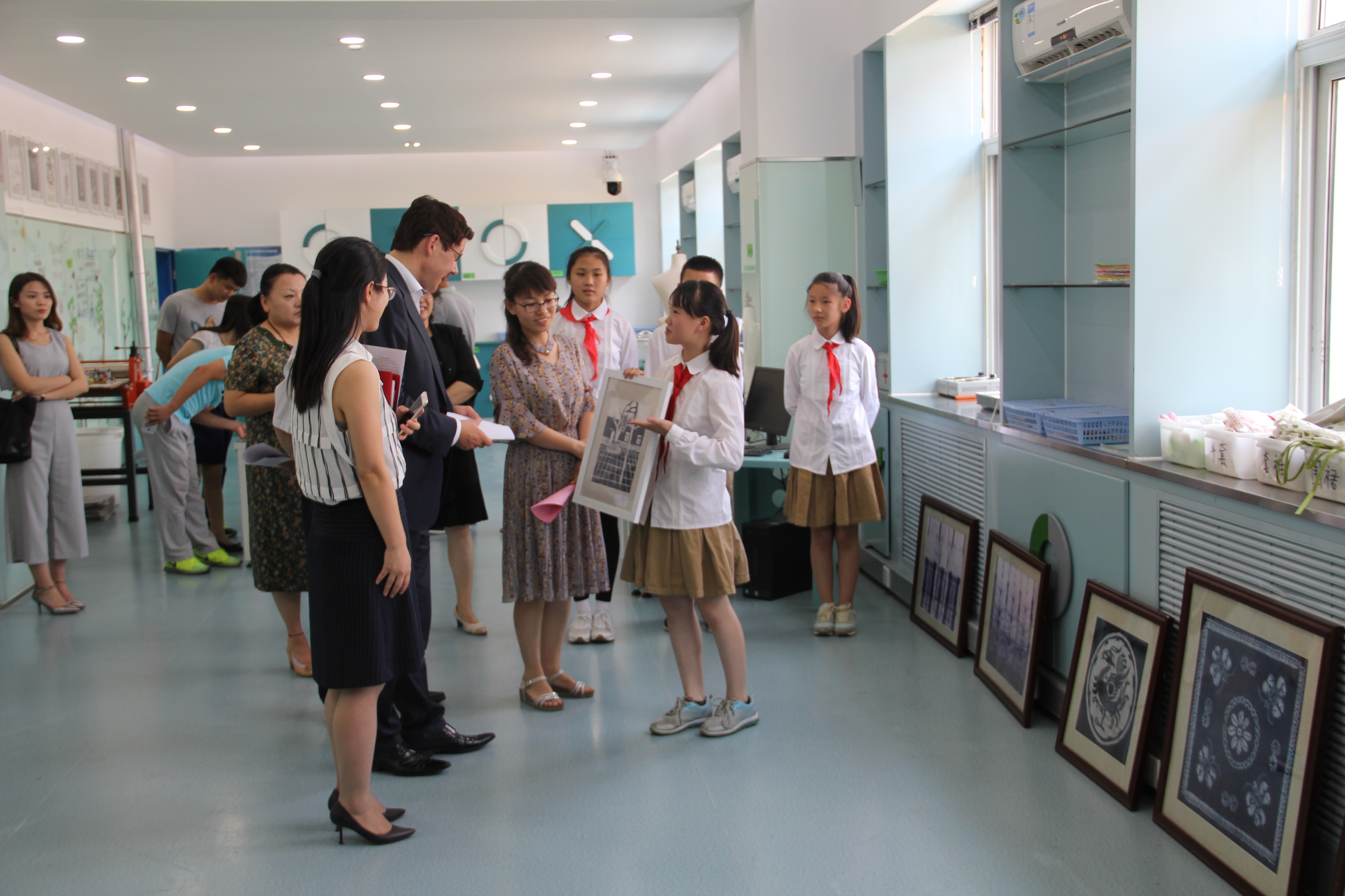 在参观学校未来实验室的过程中,日坛中学实验学校的学生热情大方地用英语向国际友人介绍了每个项目组的学习内容和收获,亚力校长与孩子们亲切交流。当看到亚力校长对自己的作品流露出极大兴趣与赞赏时,孩子们提出要将自己所作的黑白版画和手工作品赠送给芬兰校长,亚力校长高兴地接受了孩子们的礼物,并表示要带回芬兰珍藏。
