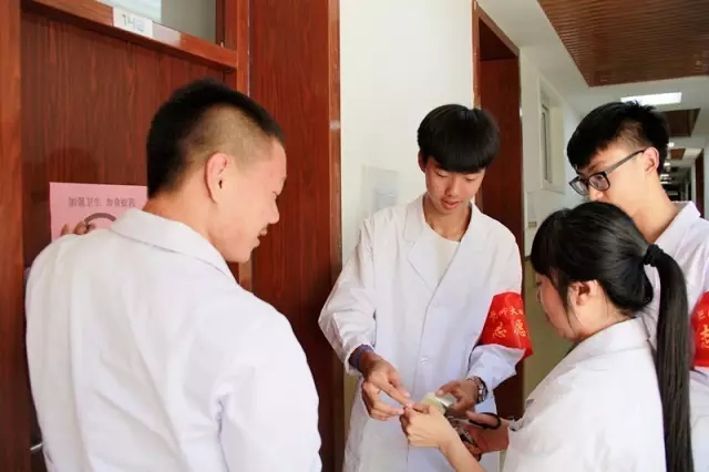 高一同学:平常同学们认为校医的工作是简单而又轻松的,比如给同学看病,开假条等简单的工作,今天才知道校医的工作不简单。检查疫苗接种手册需要考验记忆力,整理病假条需要耐心。同学们穿上白大褂的那一刻,内心中的责任感油然而生。