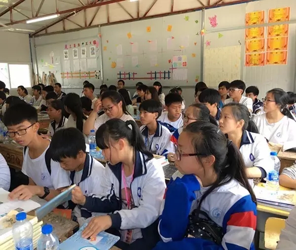 联欢会结束之后,云岗中学的孩子们在小伙伴的带领下,纷纷来到教室,和小伙伴们共上一节课,有的上数学课,有的上地理课,有的上音乐课。课堂上,大家认真学习,积极回答问题,虽然板房条件艰苦,但是因为好朋友的陪伴,课堂里多了一份温馨和幸福。一节课的时间很短暂,下课铃声响起,许多伙伴手牵手来到食堂,大家在枫边学校的食堂里,共进午餐。