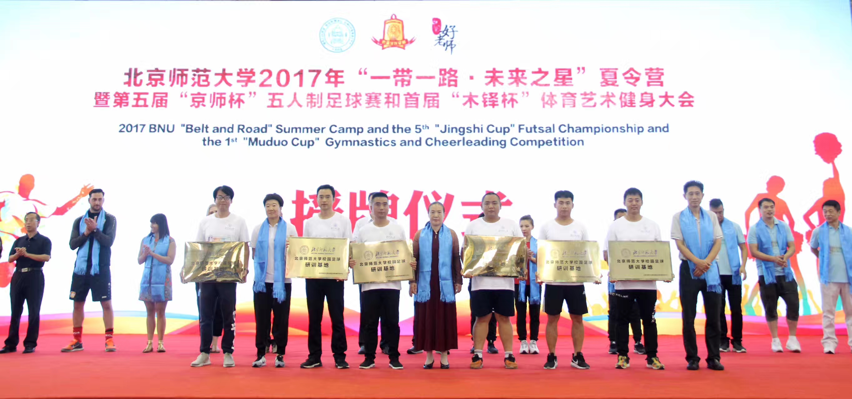 该校校被授予“北京师范大学校园足球研训基地”的荣誉称号,康玺老师上台接受授牌。