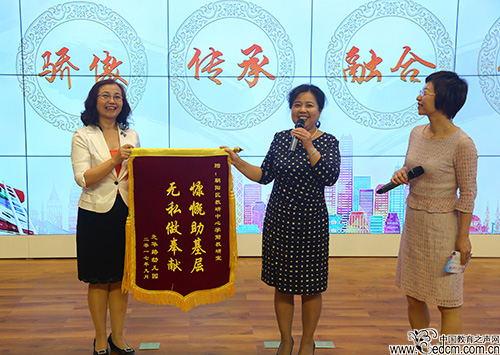 光华路幼儿园的肖颖园长向学前教研室许美琳主任献锦旗