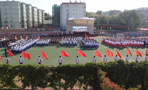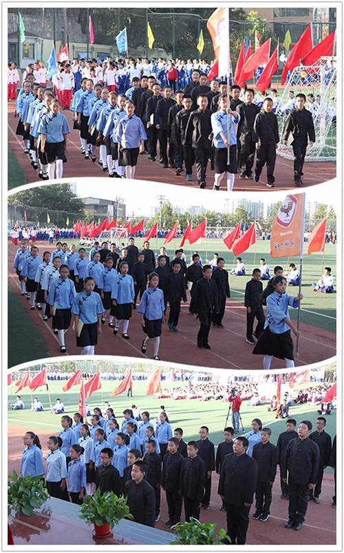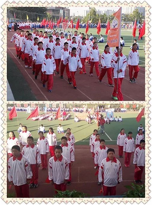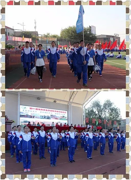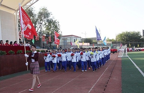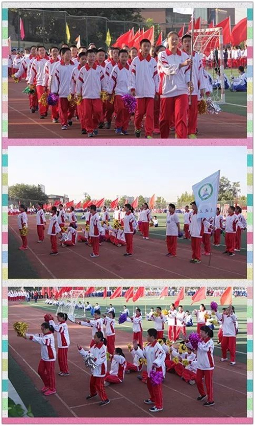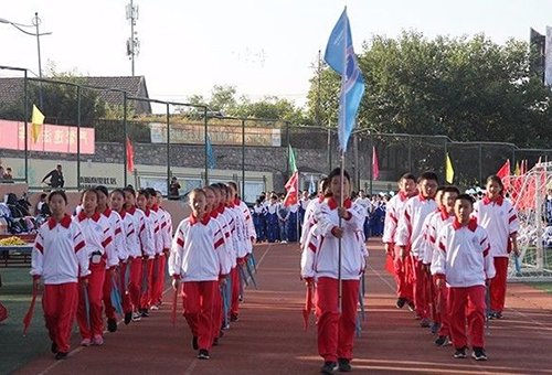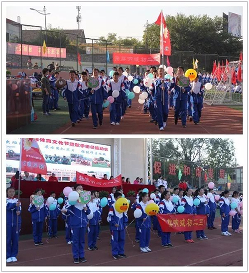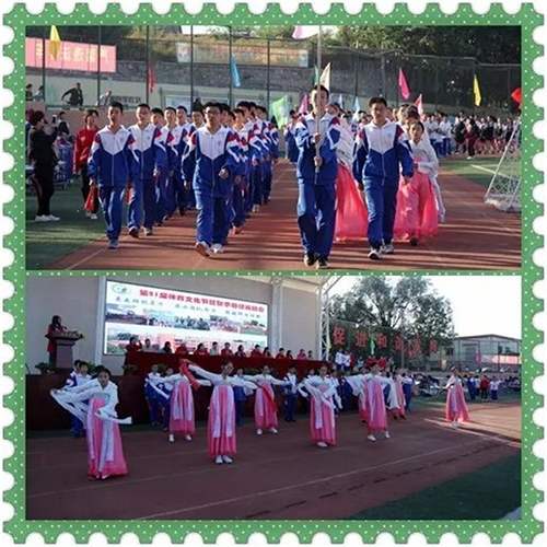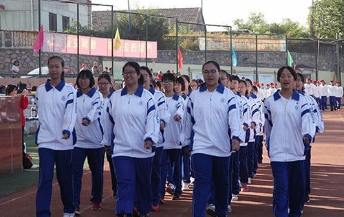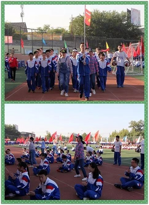 在欢快的《运动员进行曲》中,国旗队、校旗队、会徽队、语录牌队、高三男生红旗队、高三女生花束队、教工代表队、初一年级7个班级、初二年级6个班级、初三年级、高一年级男生方队和高一女生方队、高二年级4个班级依次入场。