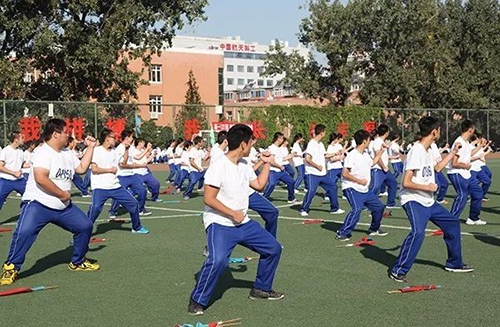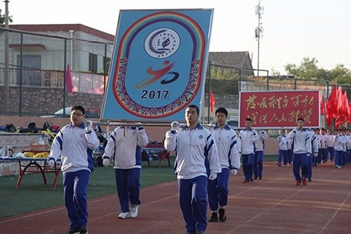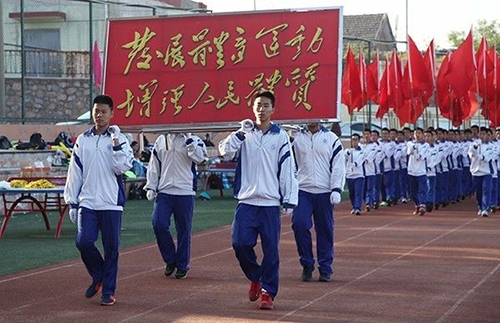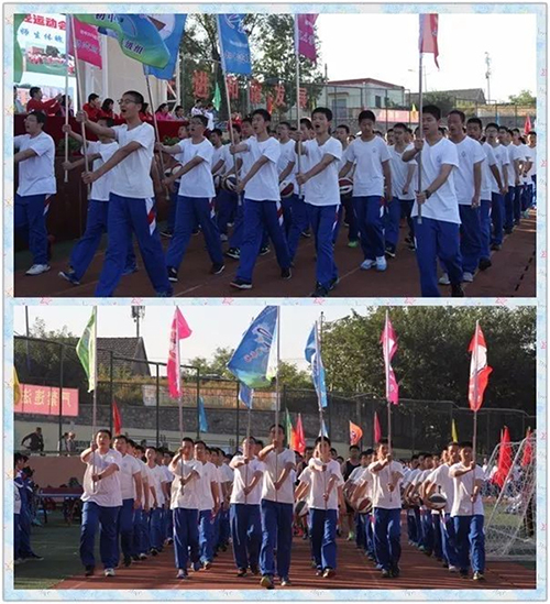 高一年级的“致知”、“志远”、“智承”3个班级组合成男生方队和女生方队走过主席台。他们豪气干云,意气风发,汇集天地灵气,擎起奋斗大旗。