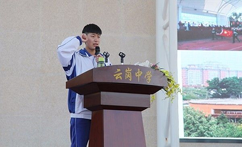 国旗班入场。我校国旗班在2015年9月正式成立,由高一、高二年级学生骨干组成的国旗班的同学们通过课余时间的刻苦训练,不断提高自身素质。身上一抹橄榄绿,心中点亮报国情,他们是云中学子的优秀代表,是学校的骄傲。在明媚的阳光下,全体师生唱响国歌,鲜艳的五星红旗冉冉升起。