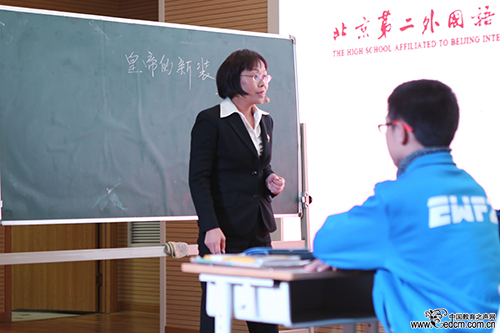 在《皇帝的新装》课堂展示部分,范红英老师将课堂分为“小组分享”、“学生谈启发”、“拓展比较”三个环节。整个课堂完全让学生成为主人,学生踊跃积极提出问题,共同互动解决,自主学到了知识。范红英老师以情境助推、用行动引领、以思想润泽,形成了师生和谐共荣的良好的课堂氛围。