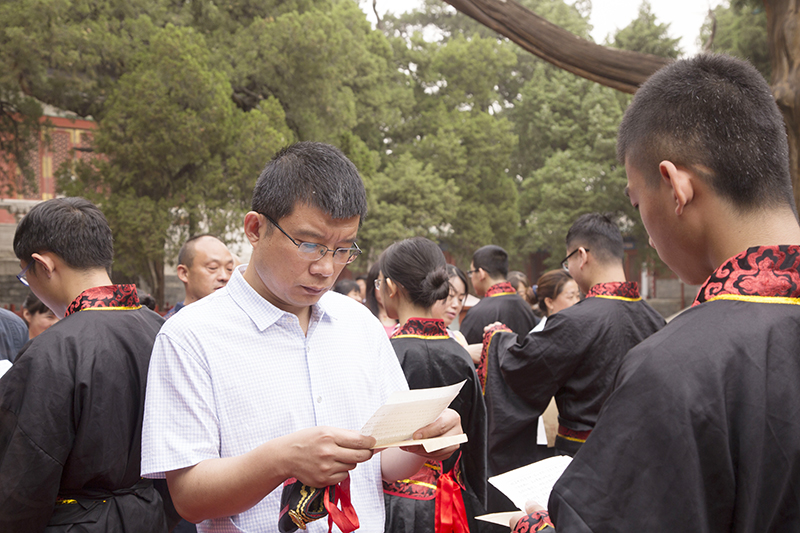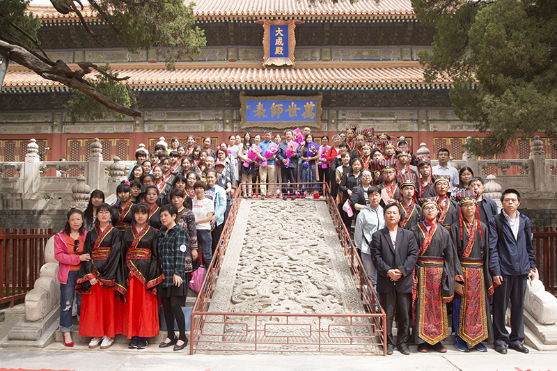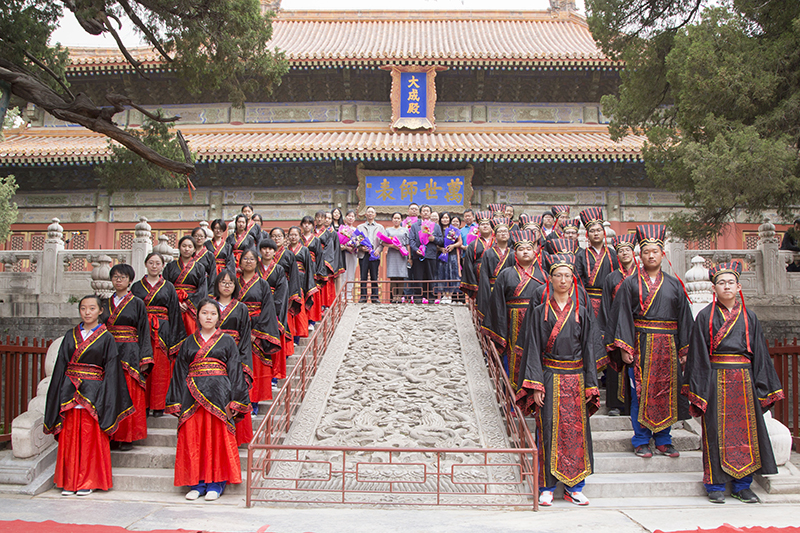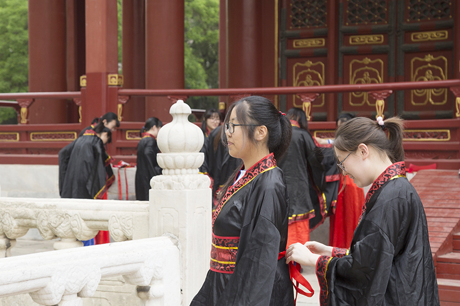 在司仪老师的带领下,同学们身着汉服,相继跨入大成门,大成门是文庙的最后一道大门,门槛甚高,进大成门谒圣庙者自然小心举措、端正举止,符合圣庙谨严的气氛。跨入大成门也就是跨入了成年的门槛,寓意着长大成人。