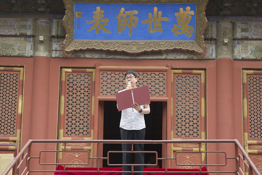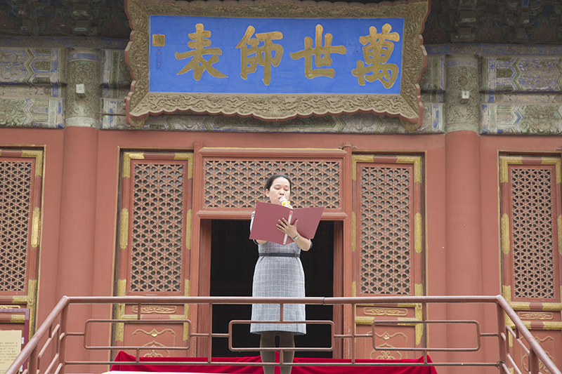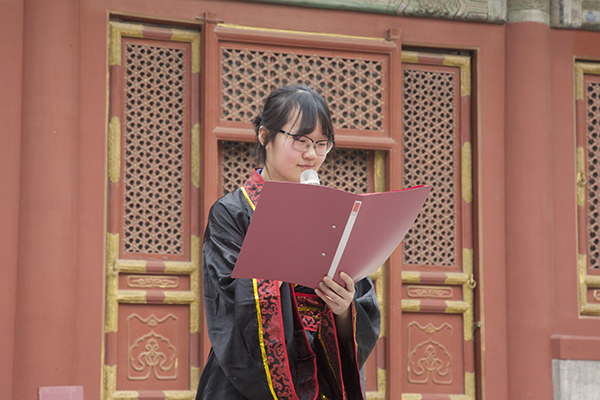 在大成殿前会场,高三2班何瑄同学作为学生代表,发布成人宣言,表达了成年的喜悦和对未来的信心;高三5班果维宣同学家长和高三1班班主任李妍老师分别代表家长与老师发言,对同学们致以衷心的祝福和殷切的期望。