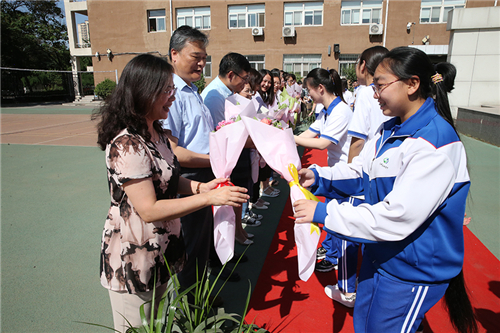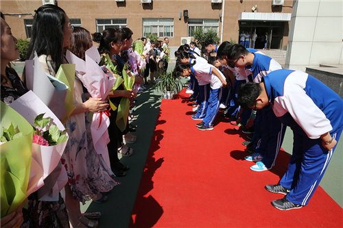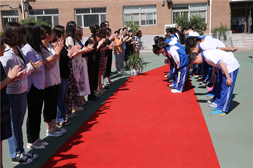 2018年6月4日的仪式是为欢送高三年级而举行。学校准备了红毯,预示着2018届考生鸿运当头、走向辉煌,高考取得好成绩。