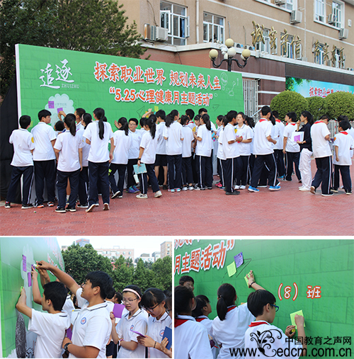 在接下来的两个活动中,同学们了解了兴趣与职业的关系,探索了学科兴趣与职业兴趣,清晰地了解自己的能力、性格和价值观,在这个过程中,同学们充分发挥想象力,在名片上写下了自己的梦想:宇航员、科学家、工程师、画家、设计师……“我喜欢画画,也许我会成为画家,也许我会成为设计师,但我希望用自己的画笔来为大家带来美的享受。”“我想从事航天事业,当我看见我们国家的火箭上天时,我特别自豪。”最后,同学们把自己的梦想贴在了梦想墙上,为自己设立了目标。