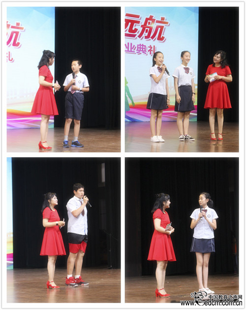 互动环节中,学生、老师和家长分别走上台,道出了自己的心声。学生说,因为喜欢一位老师,而喜欢一门课程,从此激发了内在的学习兴趣,感谢老师的指点和教导。老师说,陪伴孩子成长是一件幸福的事,六年的点点滴滴都不会忘却,希望孩子能走得更远。家长说,孩子在学校收获良多,不仅学会了知识,还养成了好习惯,这将让孩子受益一生。当全场观众沉浸在台上人的话语中时,也不忘观看投影到大屏幕上的沙画表演,学校校门、学习场景、活动场景、运动会场景……六年的时光被浓缩成一幕幕生动有趣的画面,让大家大开眼界。