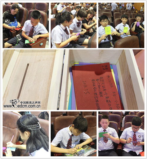 本次活动中,最特别的环节是制作梦想卡环节,这是生涯教育与毕业典礼的完美融合:当同学们明确了自己的目标和梦想,才能更有动力继续前行。为此,在生涯导师的带领下,同学们纷纷在彩色卡片上写下了自己的梦想:“我喜欢科技,以后想当宇航员,想去外太空看看!”“我想成为一名老师,希望自己永葆童心。”“我和我的好朋友约定,在画画的道路上永不停歇!”写有同学们梦想的卡片被封存在一个个宝箱中,大家相约六年后再次回到母校,穿越时光隧道,看看自己是否实现了最初的梦想。