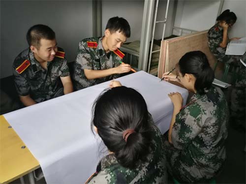 除了每天的常规军训,学生们还学习了内务整理的标准和要求,体验了丰富充实的军营生活。在各班主任的带领下,他们集思广益、发挥才智,将他们对军训生活的切实体悟融入板报的制作当中,一幅幅生动精美的板报体现出学生们对军训生活的留恋与热爱。