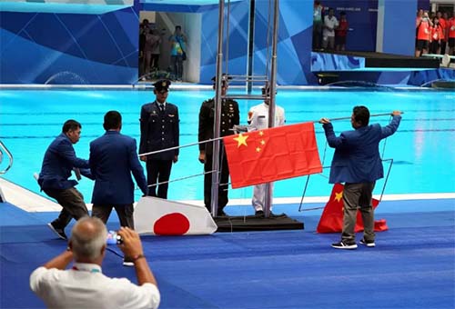 孙杨随即和主办方交涉,要求重升国旗、重奏国歌。从现场视频可以看到孙杨的嘴型在屡次重复“one more time”。最终,在孙杨的坚持下,现场工作人员重新整理国旗,重新举行升旗仪式。于是,在亚运会游泳场馆内,再次奏起响亮的中国国歌,升起鲜艳的五星红旗!