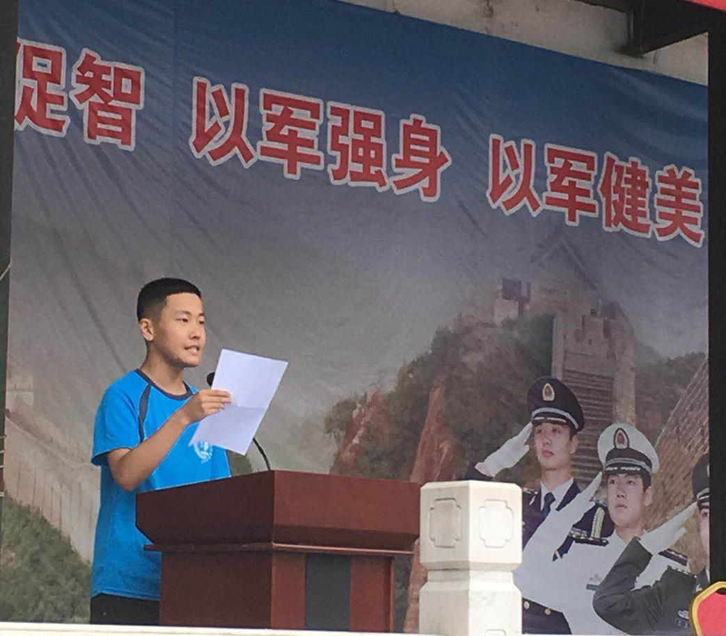 新生代表王烨炀代表全体新生表达了对学校和军训基地提供军训机会的感谢,也表达了认真参与、努力坚持、积极成长的决心。