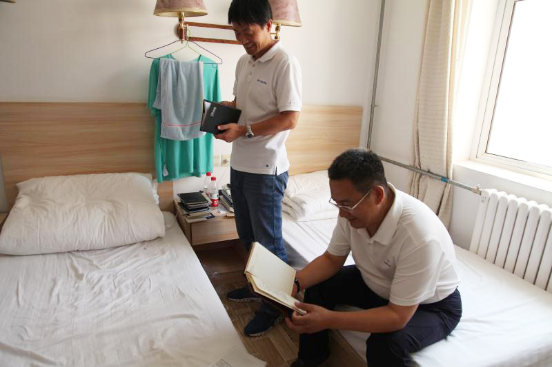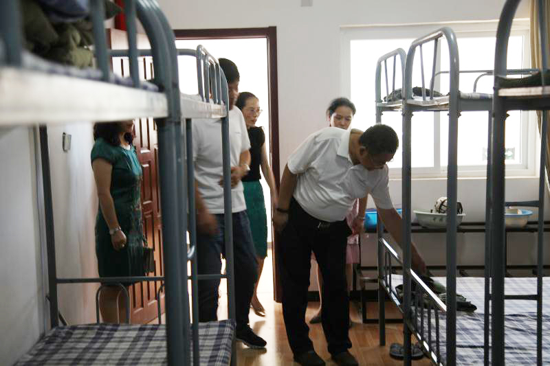 之后,领导们参观了老师宿舍,在宿舍内询问了老师们的工作和生活情况,对老师们和医务人员的辛勤工作表示了肯定。张校长和师书记查看了学生们的军训日记,表扬了部分学生日记中展现的良好精神风貌。参观完教师宿舍,慰问团一行来到了学生宿舍,摆放整齐的物品、方方正正的“豆腐块”军被和干净的地面卫生得到了各位领导的一致好评。