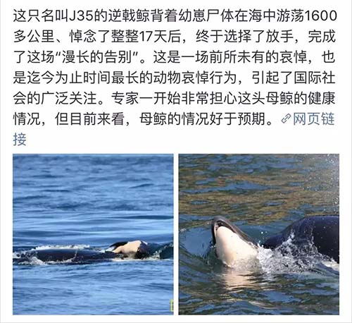 他说自己想去看看那条鲸鱼——这是另一条来自西雅图的新闻,一条逆戟鲸背着自己幼崽的尸体在海里游了17天才决定放手。