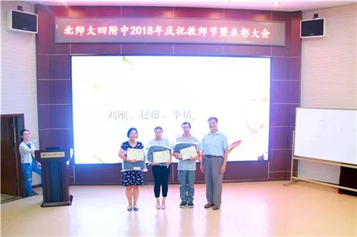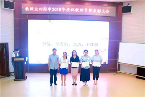 北师大四附中在过去的一年中可谓硕果累累。我校荣获2018年丰台区中考优质校、丰台区高考文科、理科优类校;李倩、李秀娟、郑洁、王红梅四位教师被评为“丰台区优秀教育工作者”;赵薇老师被评为“丰台区青年新秀”;王囡老师被评为“北京市师德模范先锋”;刘刚、赵薇、李倩三位教师被评为“丰台区师德先进个人”;田小容、王秀清两位老师被评为“2018年丰台区中小学优秀班主任”;又有徐娜、刘畅、李杨斌、刘轶、王红梅、李佳艳、关震、李鑫亚、苏立雨、高庆军、杨娜(大、小)、汤云丽、王双远、赵静、马楠、高庆军、刘伟、尹江红、刘雅倩、周岩、王秋爽、吴琨等22位老师荣获“一师一优课”部级、市级、区级各类奖项。