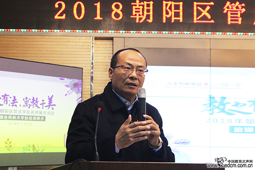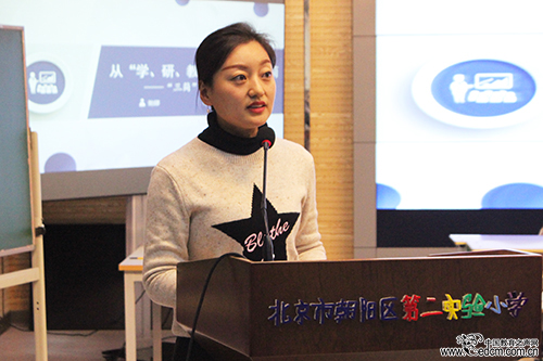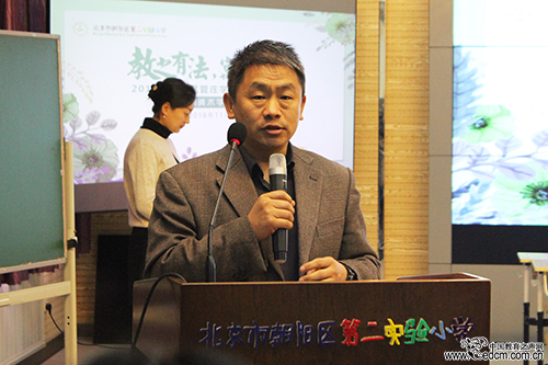 朝阳区第二实验小学校长郝朝阳致辞。郝校长分享了自己对教师职业之路的看法,他认为,绝大部分教师都愿意拥有快乐多彩的教学生涯,他们通过每天的思考与实践,既有师爱,又备师能,协调迈进,这才是赢者之路。郝校长评价道,鲍娜老师开辟了另一条路,即“简者之路”,他预祝本次展示活动取得圆满的成功。
