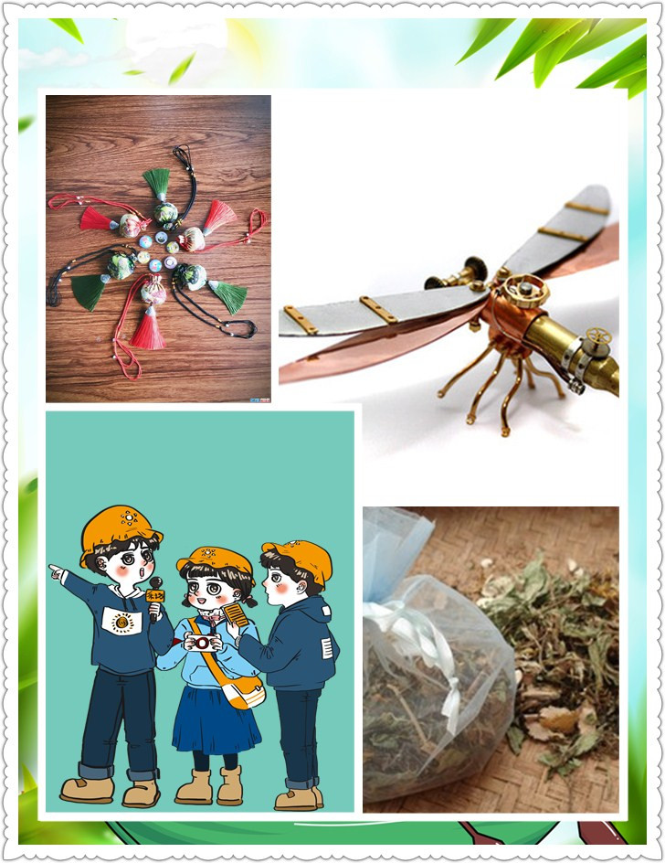 自然+美术+科技+主持 驱蚊药材讲解,DIY手绘香囊,蜻蜓朋克,模拟小记者。