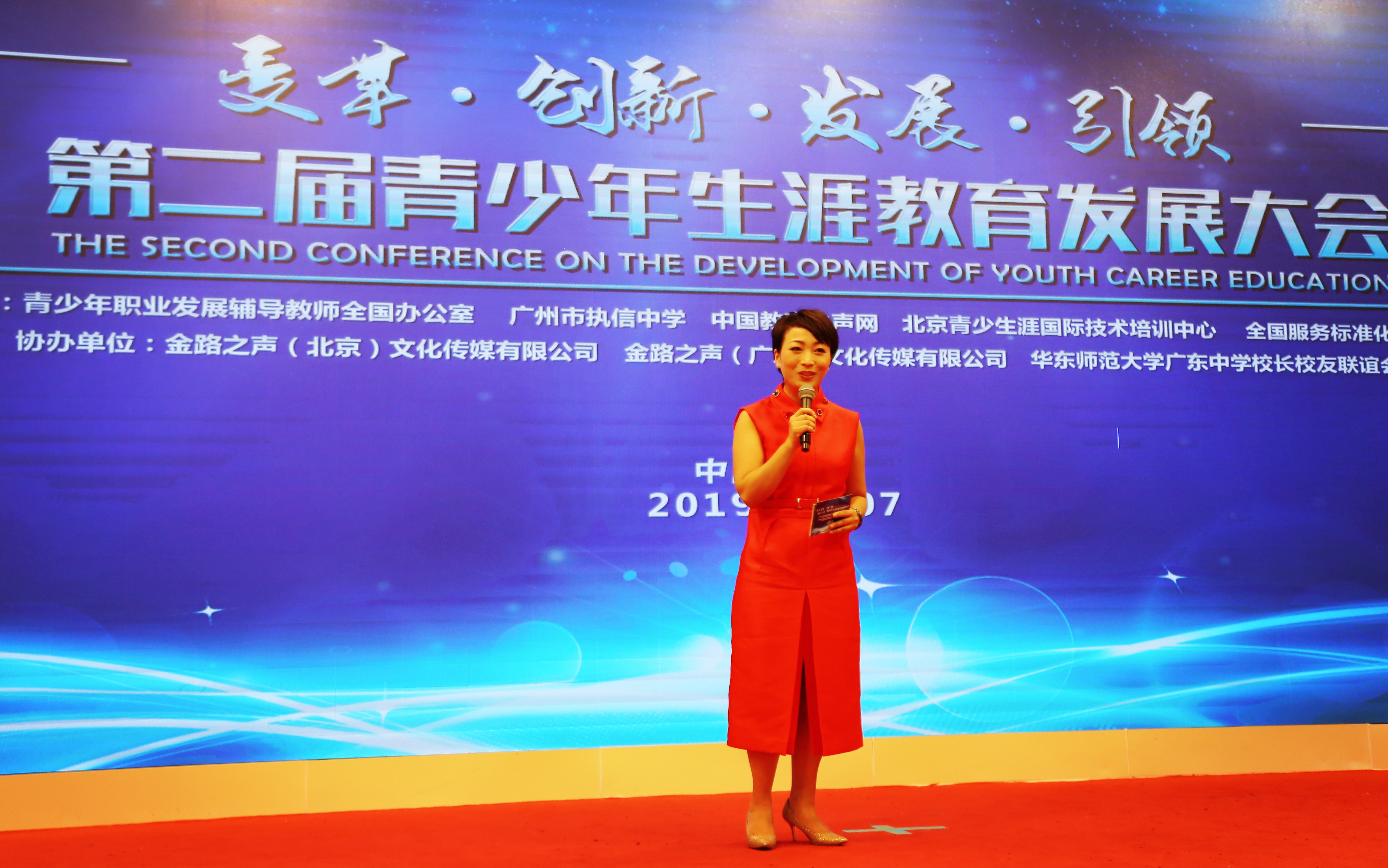 2019年7月7日,由青少年职业发展辅导教师全国办公室、广州市执信中学、必威体育官网网页版 、北京青少生涯国际技术培训中心、全国服务标准化技术委员会主办,金路之声(北京)文化传媒有限公司、金路之声(广东)文化传媒有限公司、华东师范大学广东中学校长校友联谊会协办的第二届青少年生涯教育发展大会在广州市执信中学隆重举行。青少年职业发展辅导师全国办主任徐建娟(徐小璐)主持大会。
