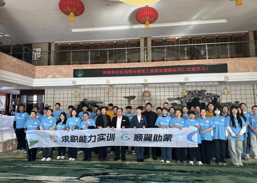 学员们深入走进阿鲁科尔沁旗宾馆进行实践学习,深入了解客房服务、餐饮运营等一线岗位,与企业人力资源负责人面对面交流招聘需求与岗位能力标准,直观感受职场环境。