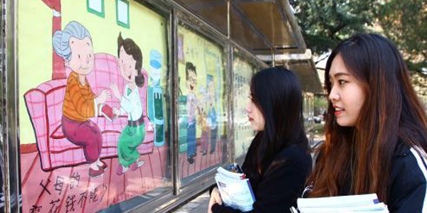 “和父母一起锻炼身体”、“教父母学会上网”等入选山东大学生亲手绘制的新二十..