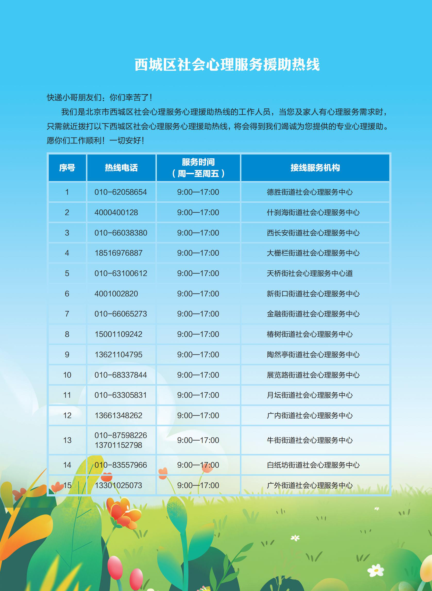 但他们并不孤单,展览路街道社会心理服务中心始终牵挂着他们。为了帮助快递小哥及其家人缓解生活、工作中的心理困惑,我们特别开通了西城快递小哥社会心理服务援助热线。这是一条充满温暖与关爱的热线,专业的心理服务团队随时准备为他们排忧解难。